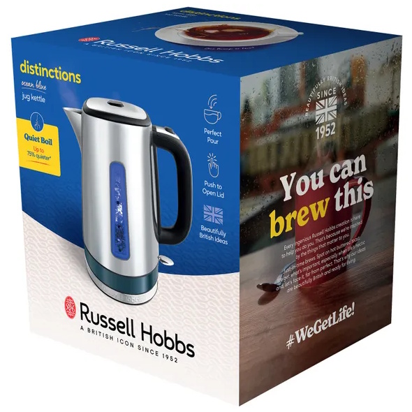 Stylish and bold with striking corners and curves, the Distinctions Jug Kettle Ocean brings stainless steel elegance to your kitchen with a flash of blue-green. The bubbles even burst quietly to keep the noise down while boiling thanks to Quiet Boil technology. Handling is slick and easy from top up to tip out, with a push-to-open lid, perfect pour spout and 360o base with cord storage. A generous 1.7l capacity will easily fill your teapot or pan, and boiling only what you need can save you up to 66% energy.* The handy water window shows just how much you’re using, while the removable, washable anti-scale filter collects hardwater deposits to keep your cuppa clean.